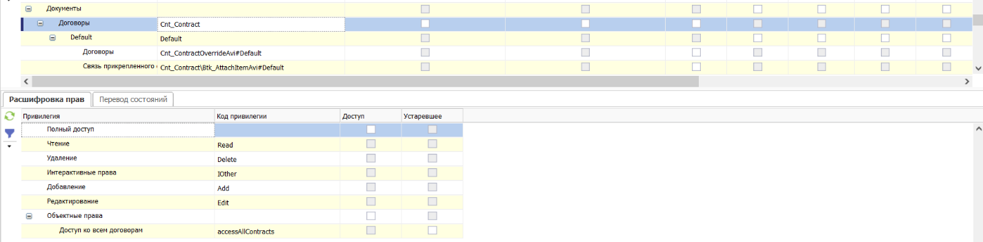 Содержат список системных привилегий — особых прав для данного объекта. Например, для договоров имеется объектное право «Доступ ко всем договорам», которое открывает владельцу возможность просмотра договоров любых ОФС. Активный признак «Не распространяются настройки администрирования» не дает доступ к объектным правам