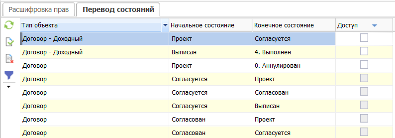 Закладка содержит список всех возможных переходов всех типов объектов класса, для которых отмечается признак доступности для роли.
