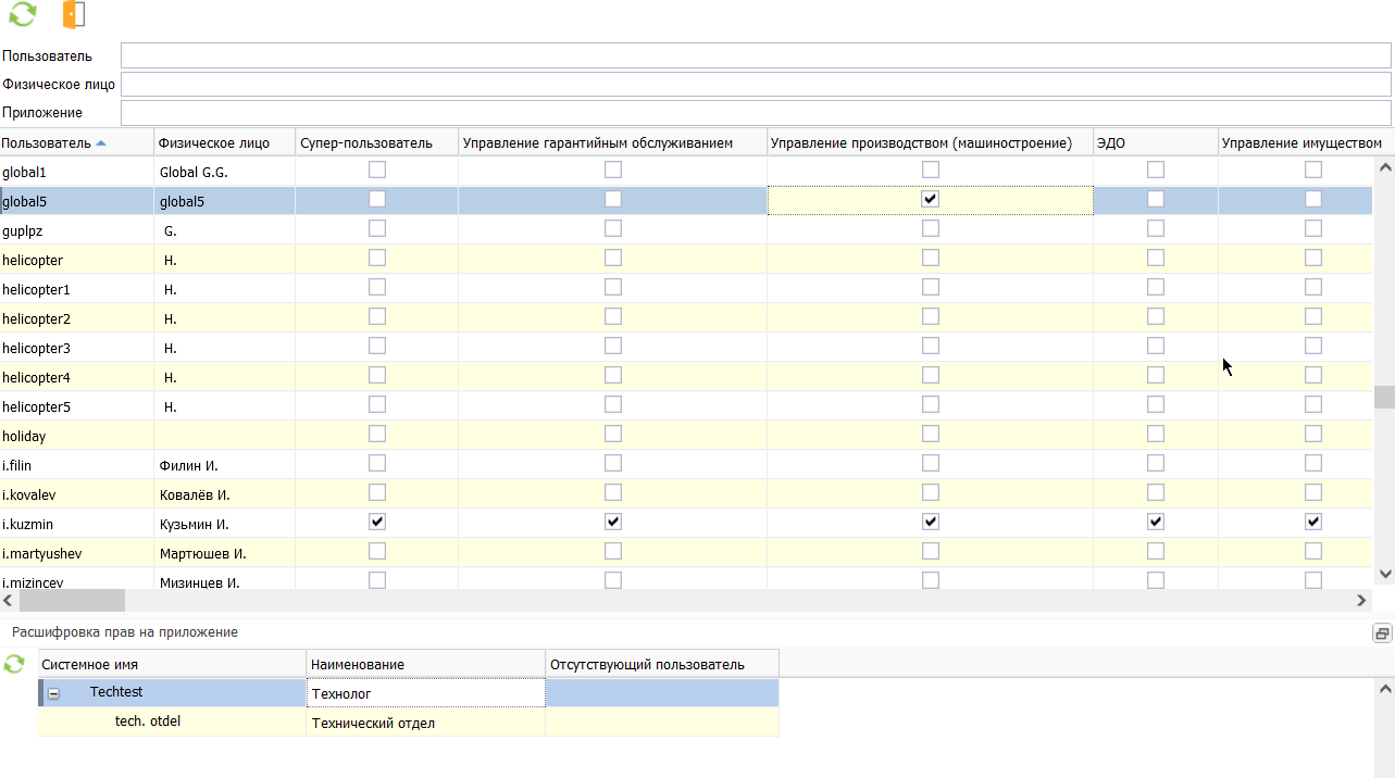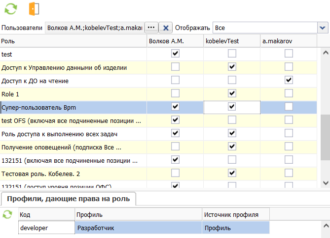 В данном примере выделена ячейка, в которой отмечен признак права пользователя petrov на редактирование БО «Заявка на закупку». Детализация содержит информацию об источниках такого права: ролях и профилях, либо о том, что пользователь замещает сотрудника, имеющего соответствующие права.
