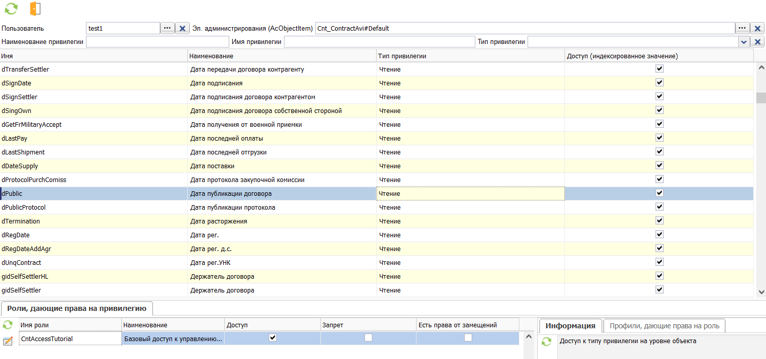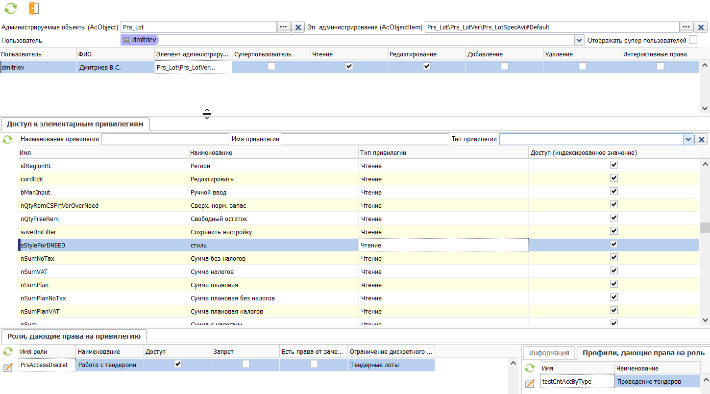 На уровне элементарных привилегий пользователю dmitriev дан доступ на редактирование атрибутов «Статья калькуляции» и «Статья сметы». Пользователь petrov также имеет право на редактирование этих атрибутов, но для него такое право выдано не к конкретным привилегиям напрямую, а унаследовано с уровня бизнес-объекта, что обозначено серой заливкой |