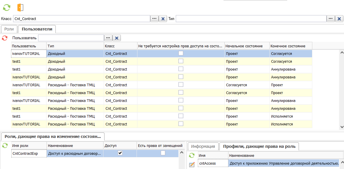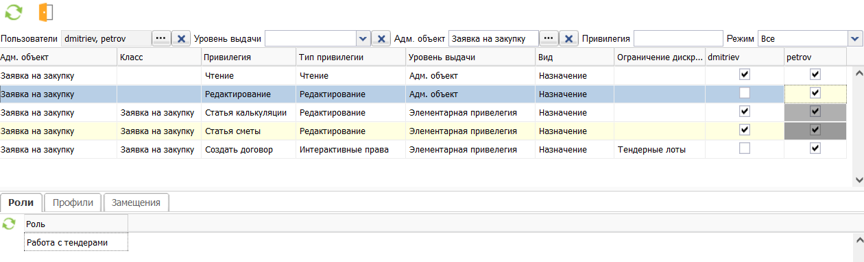 Рисунок иллюстрирует отчет, построенный для пользователей dmitriev и petrov по бизнес-объекту «Заявка на закупку», ниже приведен построчный анализ данного отчета.