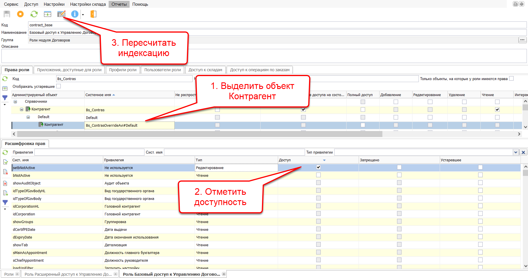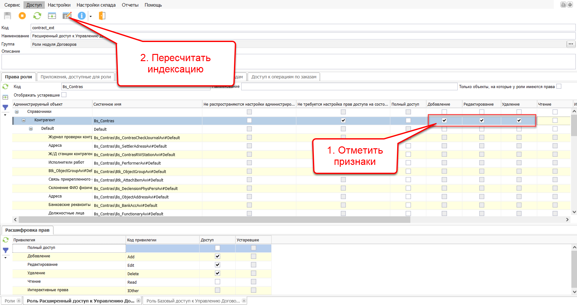 Для роли «Базовый доступ к Управлению договорами» найти в списке прав роли объект «Контрагент» по скопированному коду. Снять установленный по умолчанию признак «Не распространяются настройки администрирования», отметить признак «Чтение», пересчитать индексацию. Выдача какого-либо права на верхнеуровневый объект автоматически выдает аналогичное право и на все нижнеуровневые объекты и атрибуты. Следовательно, в данном случае выдано право на чтение, но не создание, редактирование или удаление элементов справочника и всех их атрибутов.