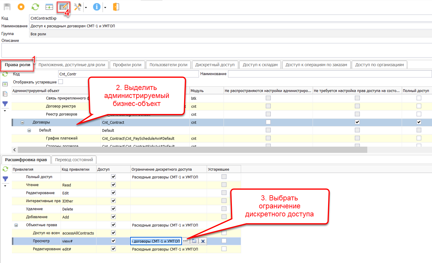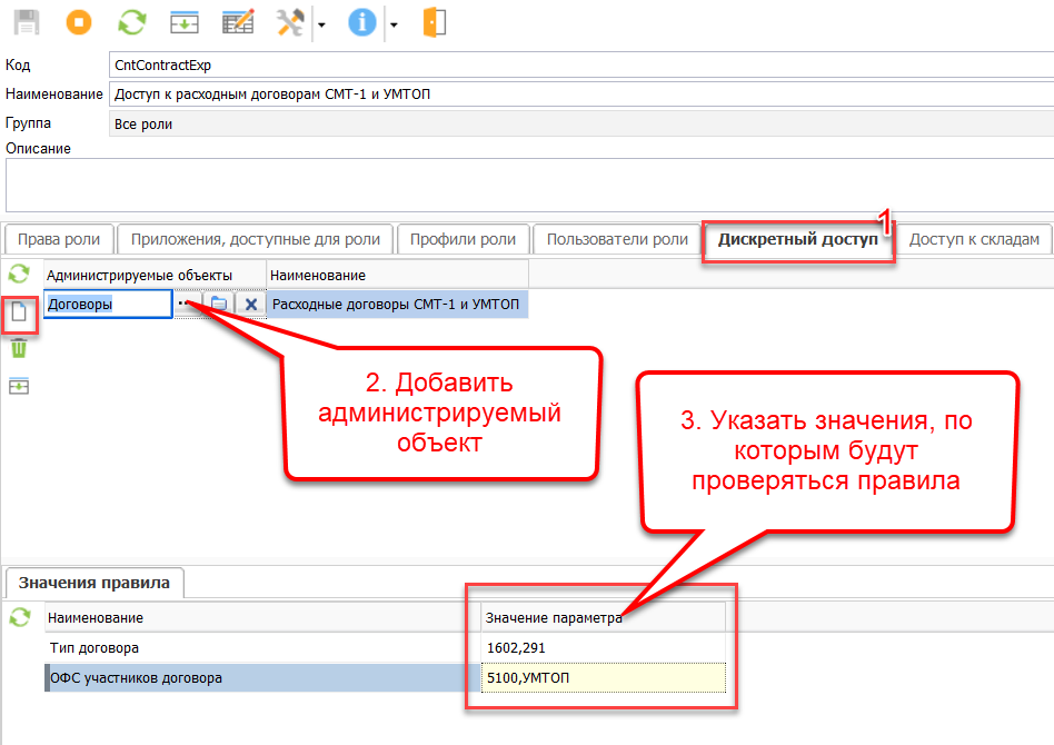 В карточке роли перейти на закладку «Дискретный доступ» и добавить администрируемый объект, доступ к которому необходимо настроить. В детализации на закладке «Значения правила» указать значения, по которым будут проверяться правила.