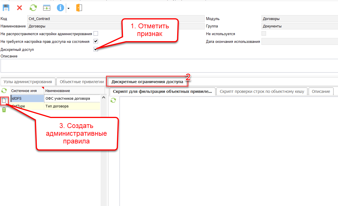 Для каждого правила вставить переданные разработчиками скрипты на закладках «Скрипт для фильтрации объектных привилегий» (отвечает за фильтрацию объектов в списках. В примере данного прецедента — скрывает из перечня договоры других типов и ОФС) и «Скрипт проверки строк по объектному кешу» (блокирует возможность открытия недоступных договоров по ссылке из прочих документов, например, запрещает пользователю открыть карточку недоступного договора из лота).