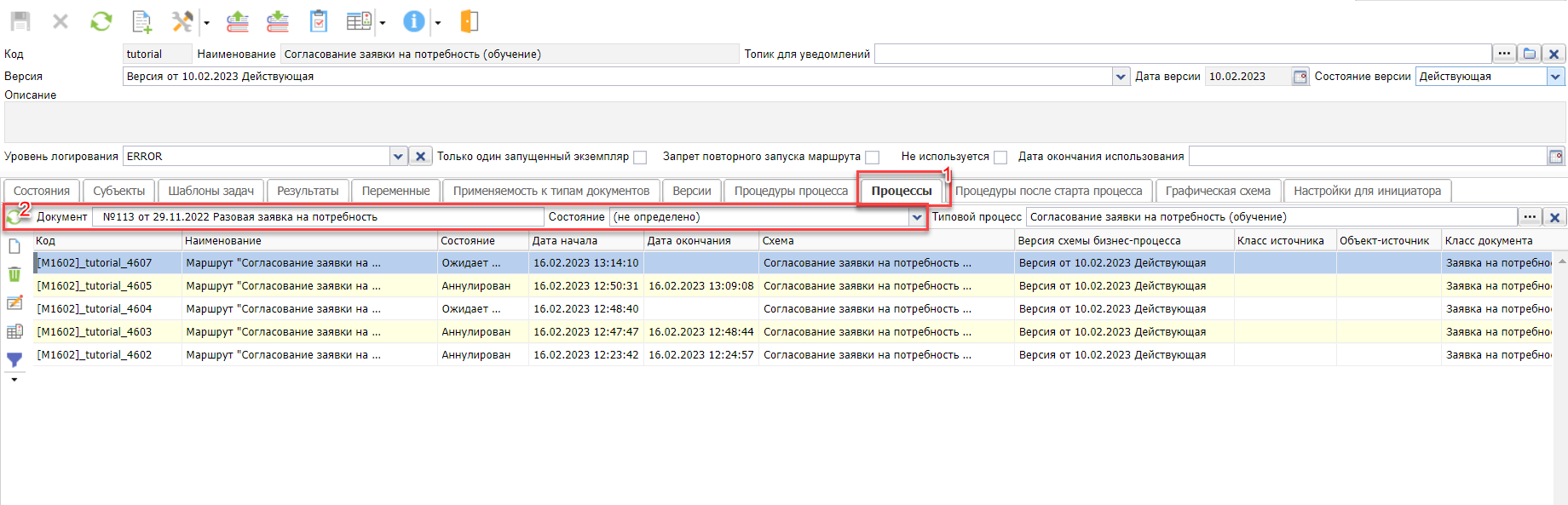 Просмотрите список процессов по своему маршруту. Узнайте значения переменных маршрута в данный момент. Аннулируйте процесс