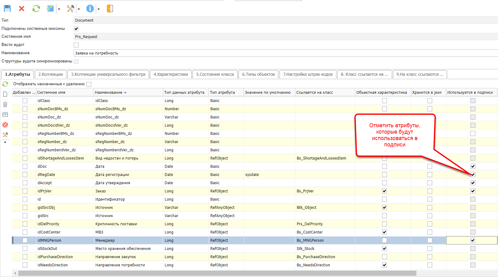 В списке атрибутов класса отметить признаками те атрибуты, которые будут использоваться в электронной подписи.