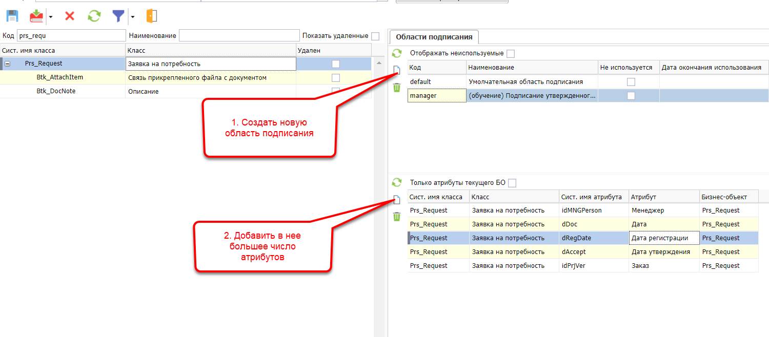 Настройте возможность подписания документа «Заявка на потребность» (Prs_Request) электронной подписью. Настройте две разных области подписания: одну для запускаемого на согласование документа и одну для утвержденного документа, включающую дополнительные атрибуты.