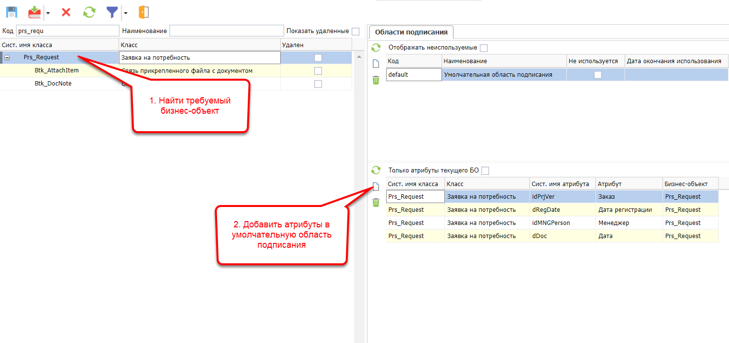 В справочнике бизнес-объектов (Сущности -> Бизнес-объекты) найти требуемый бизнес-объект. Добавить в умолчательную область подписания атрибуты.