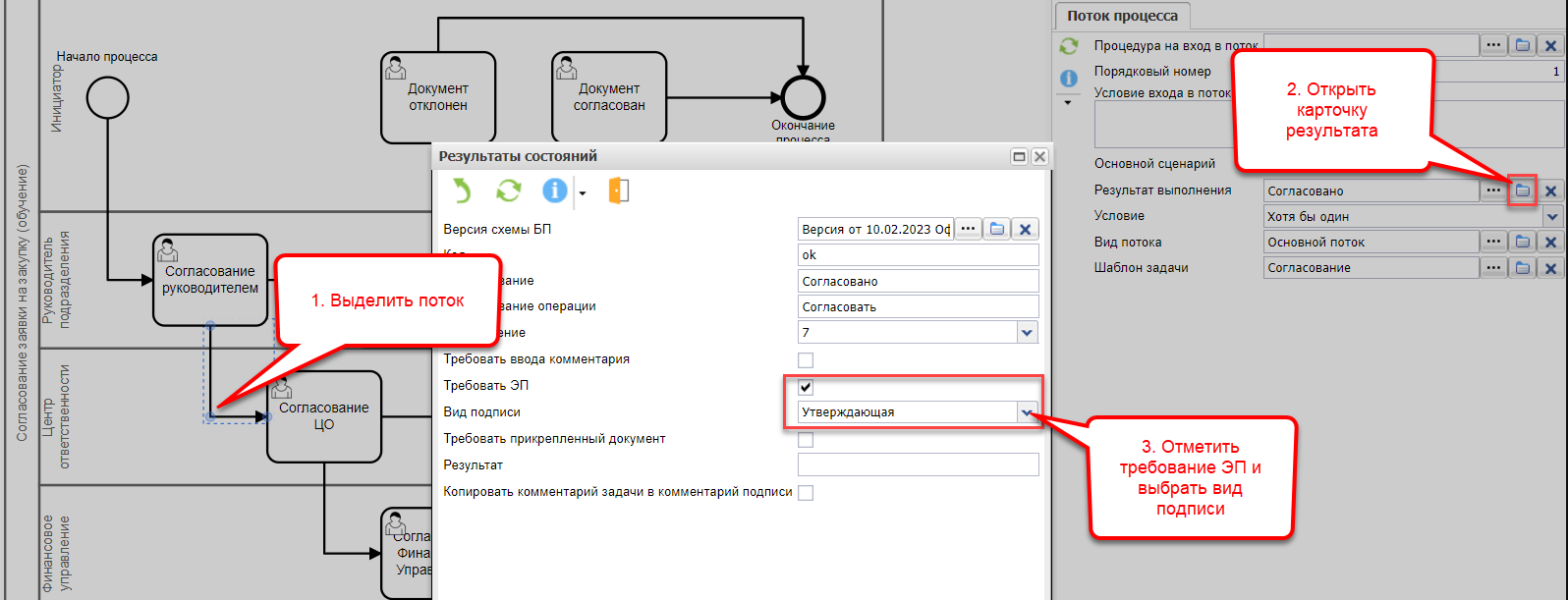 На графической схеме выбрать поток, для активации которого будет требоваться ЭП. Открыть карточку результата, требуемого для активации потока и выбрать в ней необходимость ЭП и требуемый её вид.