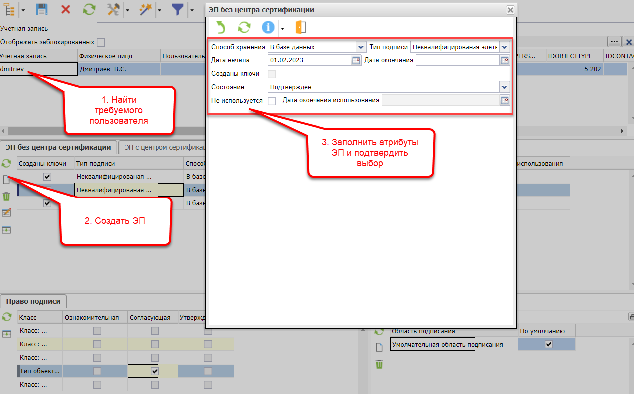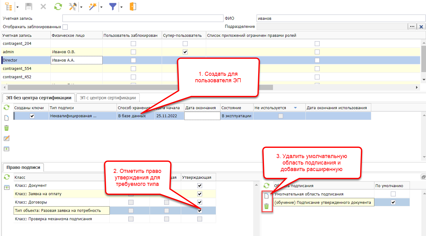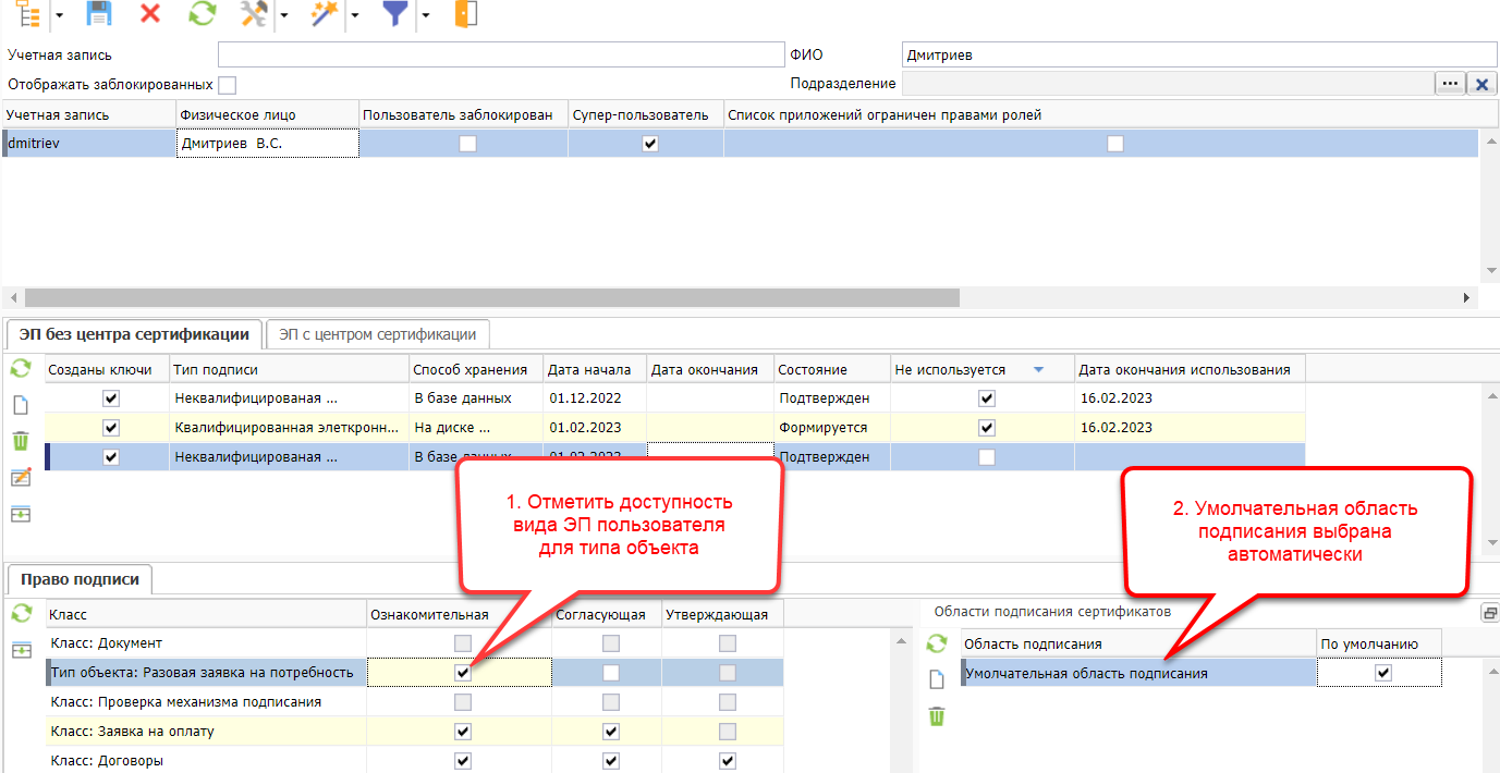 Аналогичным образом для пользователя, который будет утверждать документ, создать ЭП. Отметить право утверждения для данной ЭП и выбрать ранее настроенную область подписания с бóльшим набором атрибутов.