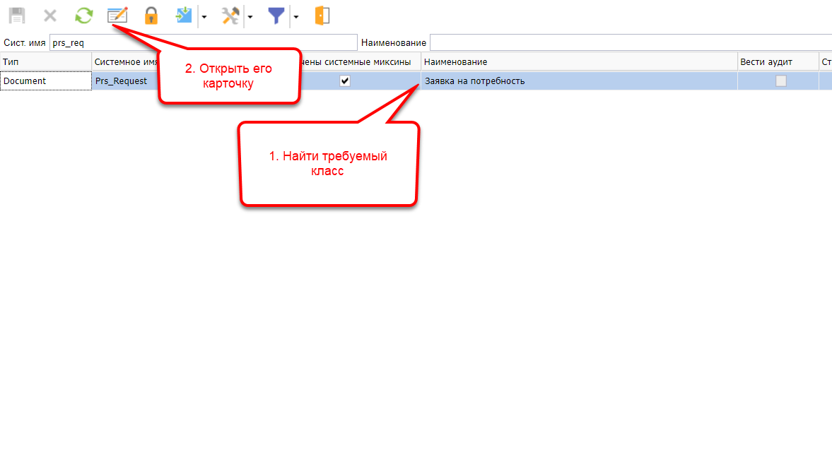 В приложении «Настройка системы» перейти в перечень классов системы (Сущности -> Классы) и найти требуемый (Prs_Request). Перейти в его карточку.