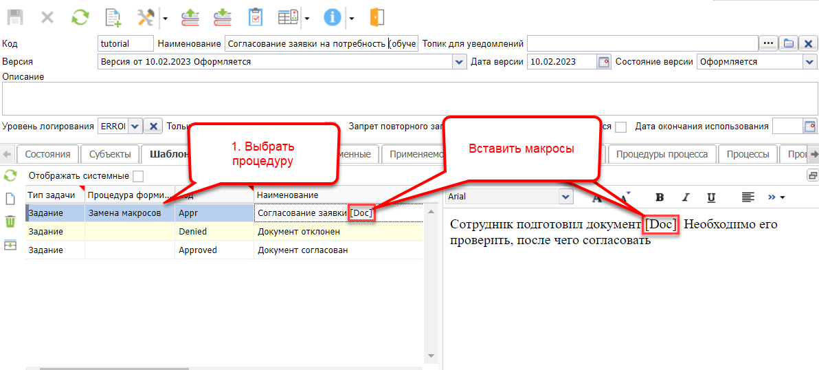 На закладке «Шаблоны задач» (либо открыв карточку шаблона с графической схемы) указать для шаблона процедуру «Замена макросов» и вставить макросы в текст наименования или текста задачи. При формировании задач по данному шаблону макросы будут заменены на соответствующий текст.