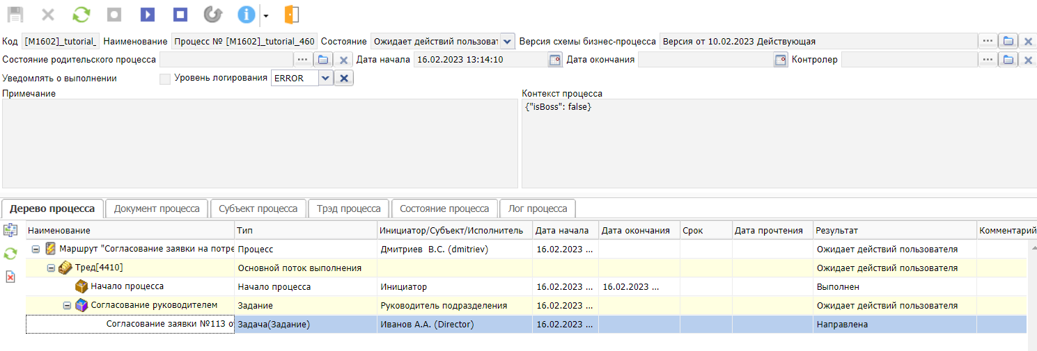 На закладке «Лог процесса» приведен лог процесса, формируемый в зависимости от выбранного для процесса уровня логгирования.