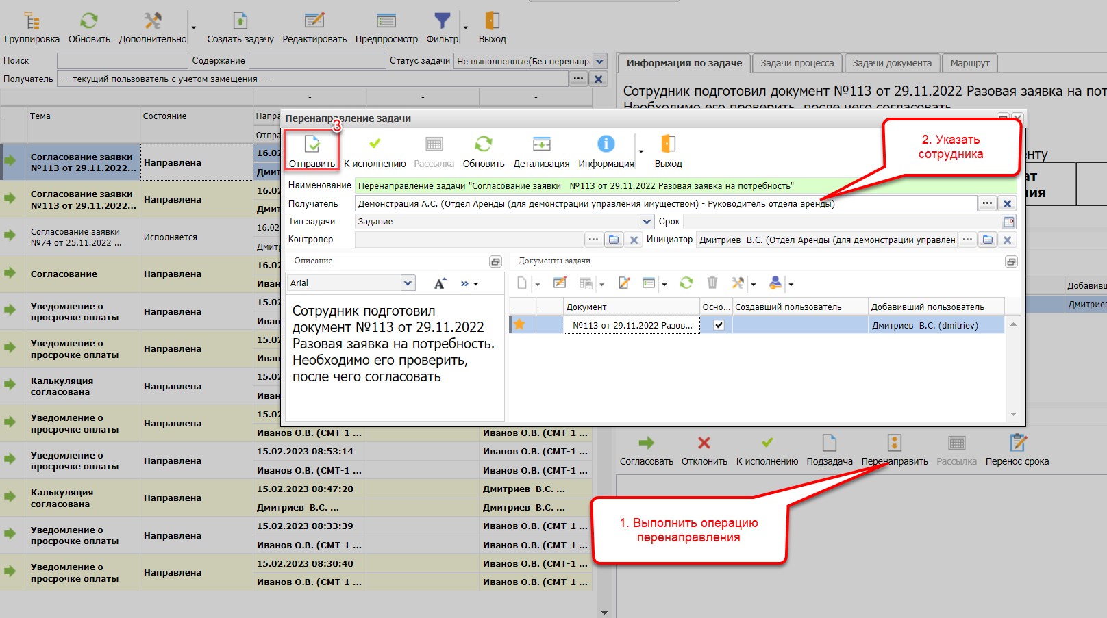 Для перенаправления задачи необходимо выполнить соответствующую операцию и указать получателя перенаправленной задачи.