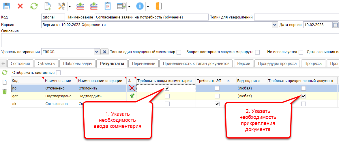 Перейти на закладку «Результаты» (либо открыв карточку результата от потока графической схемы аналогично пункту 3 выше) и для требуемого результата отметить соответствующие признаки. При выполнении задач с данными результатами будет отображено требование ввода комментария или прикрепления документа соответственно.