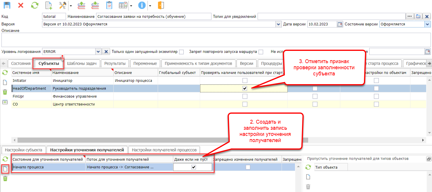 Выделить требуемого субъекта на закладке «Субъекты» (или на графической схеме). На закладе субъекта «Настройки уточнения получателей» выбрать состояние и поток, при переходе по которому будет производиться уточнение. Отметить признак «Даже если не пуст». Отметить для субъекта признак «Проверять наличие пользователей при старте процесса». При активации данного потока будет отображено окно уточнения получателей задачи.