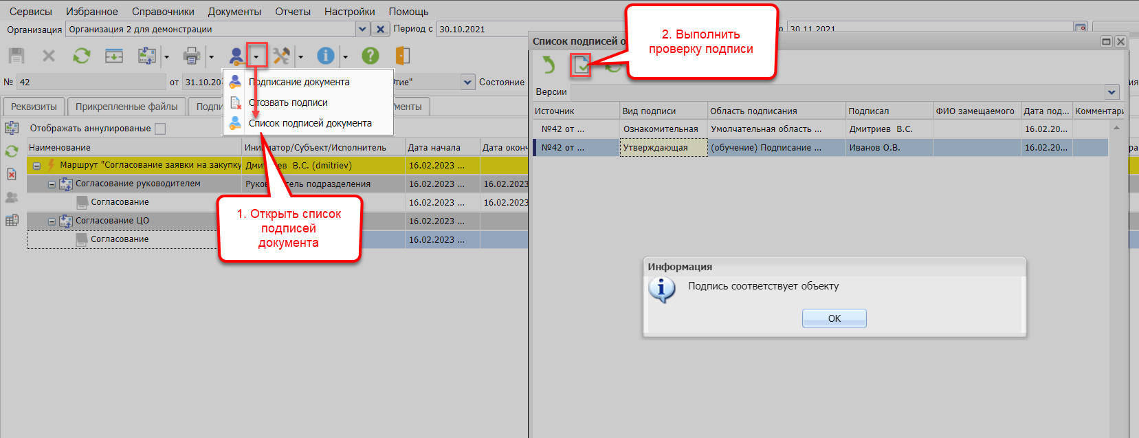 Открыть карточку одного из документов и запустить маршрут ЭД. Подтвердить согласие с подписанием документа в диалоговых окнах.