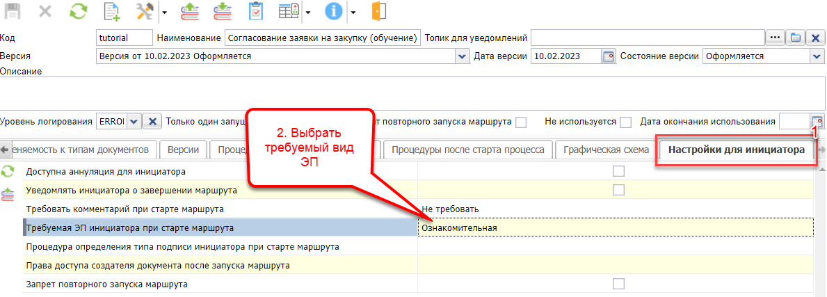 В схеме процесса перейти на закладку «Настройки для инициатора» и указать требуемый вид ЭП для запуска маршрута.