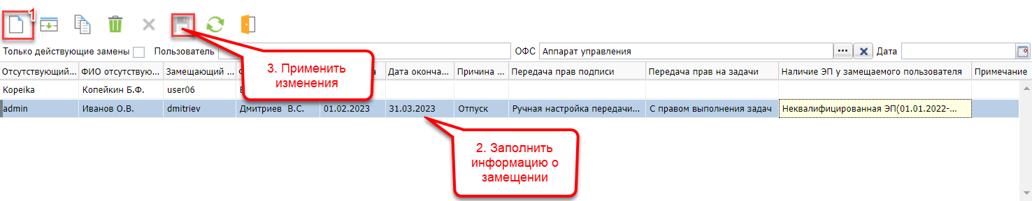 В приложении «Администратор» открыть перечень замещений (Доступ -> Замещение прав) и выполнить операцию создания. Указать заменяемого и заменяющего сотрудника, применить изменения.