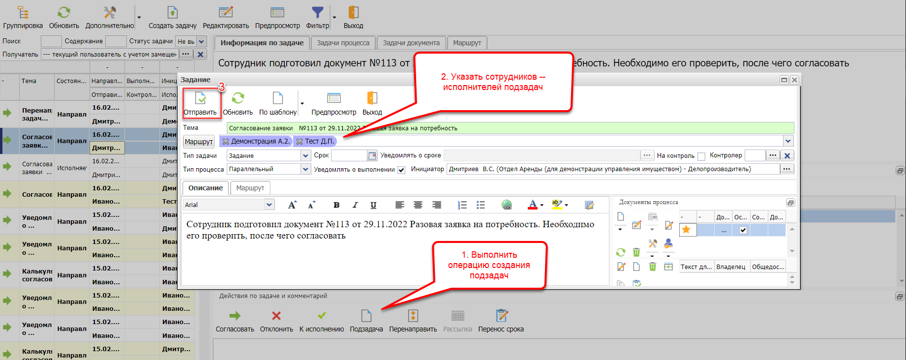 Для создания подзадач необходимо выполнить соответствующую операцию и выбрать сотрудников, которым будут направлены подзадачи. Доступно указание срока исполнения, ввод собственного текста задачи и выбор типа процесса, определяющего, последовательно ли пользователи будут получать задачи или параллельно.