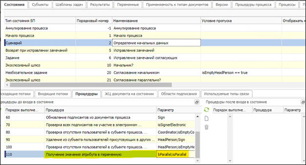 В состоянии маршрута «Определение начальных данных» при помощи процедуры «Получение значения атрибута в переменную» происходит определение переменной «Маршрут параллельный» (isParallel), а также происходит заполнение субъекта согласующих лиц (Coordinator) при помощи процедуры «Обновление состава согласующих лиц из документа».