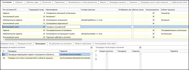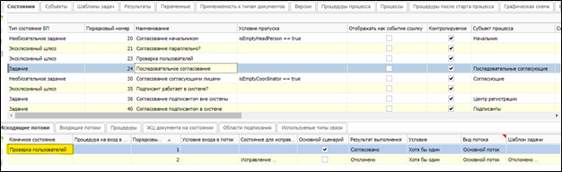 Далее в состоянии «Согласование параллельно?» с типом эксклюзивный шлюз, в зависимости от значения переменной, определяется последовательно или параллельно документ будут согласовывать согласующие лица.