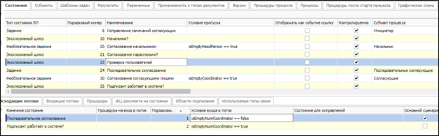 Если значение переменной «Отсутствует последовательный согласующий» = 1 (для субъекта не указан пользователь, что предполагает, что все исполнители завершили последовательное согласование), происходит переход в состояние «Подписант работает в системе?», что по сути является выходом из последовательного согласования на маршруте.