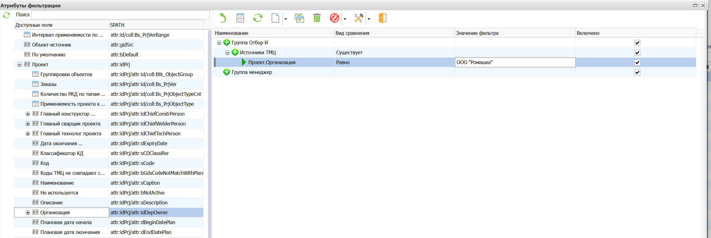Заполнение на панели доступных атрибутов: