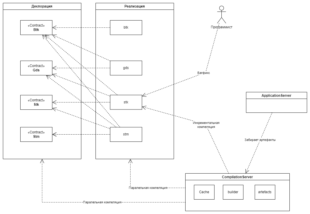 core- содержит классы и трейты, от которых может зависеть реализация других модулей (например, базовые абстрактные классы, case-классы, общие утилиты). Код в этом пакете компилируется обычным образом и может использоваться в других модулях как обычная библиотека.contracts- содержит только контракты (интерфейсы на Api, Pkg, Lib), которые будут использоваться для разрыва бинарной зависимости между модулями.src- так же является пакетом сборки, который содержит внутренние классы модуля, которые не используются в других пакетах сборки или модулях.