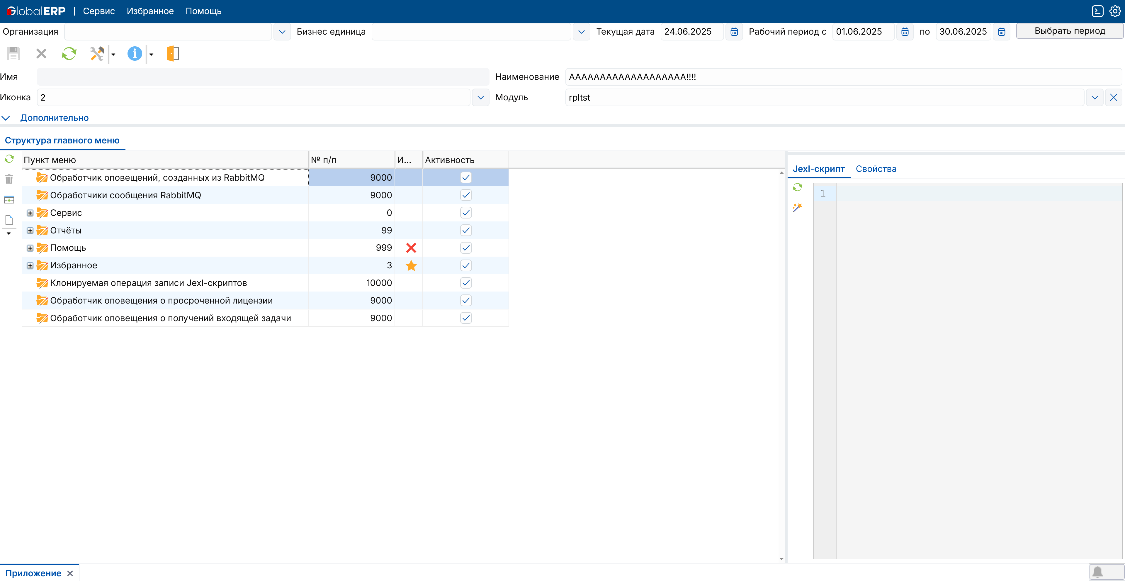 Для редактирования пунктов главного меню в детализации к карточке динамического приложения доступно дерево операций Структура главного меню. Она содержит как операции Avi-контроллера, так и добавленные пользовательские элементы.