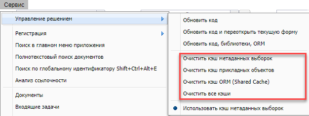 Сервисс->Управление решениембудет блок операций по сбросу кэша