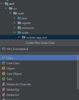имя_модуля/src/main/scala/ru/bitec/app/имя_модуля/...) создайте Scala класс, задайте ему имя в формате<имя модуля>_<имя выборки>Avi, напримерMct_ExampleAvi.