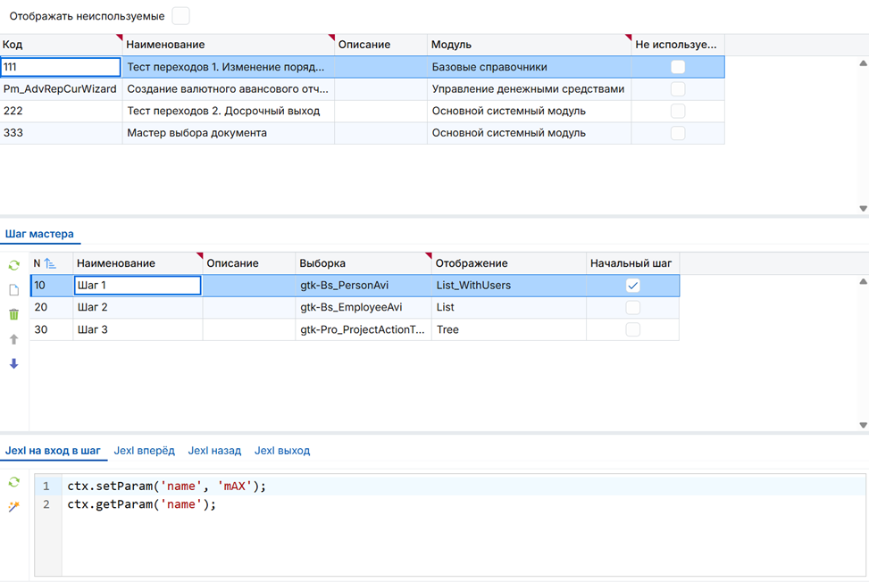 Jexl API реализует интерфейс работы со значениями параметров мастера и данных в контексте выборки через jexl-скрипты, настраиваемые на каждом шаге. Так же этот интерфейс позволяет управлять переходами между шагами мастера.