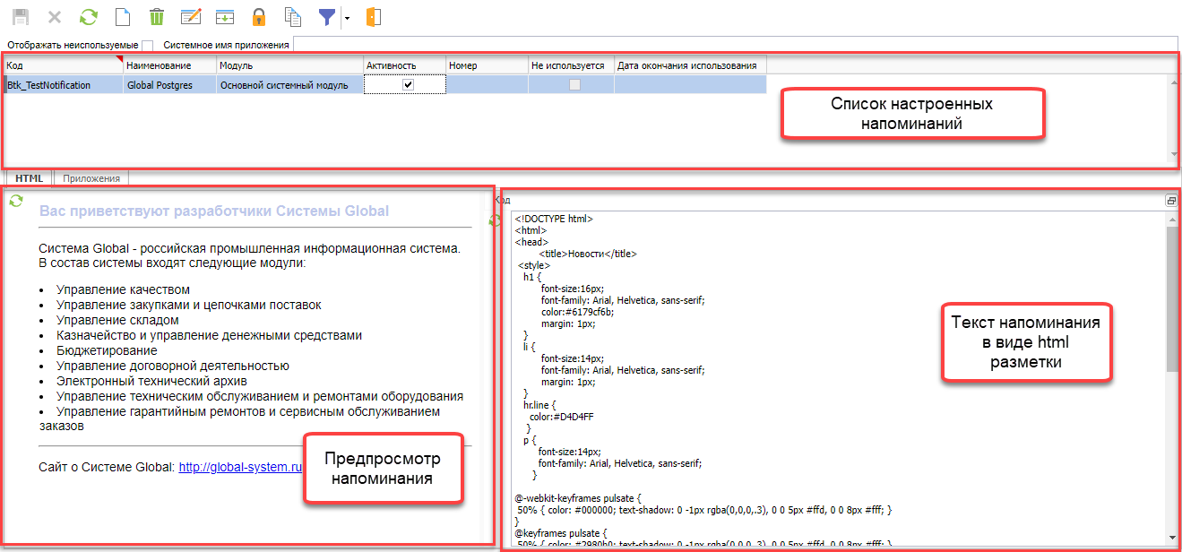 В системе существует возможность создать оповещения, которые будут открываться по умолчанию в виде отдельного интерфейса «Напоминания». При этом Система позволяет для каждого приложения настроить свой набор закладок c напоминаниями. Для этого в настройке напоминаний для записи на вкладке «Приложения» нужно задать перечень приложений. Если этот перечень пустой, то данная закладка будет выводится во всех приложениях. Если в перечне есть записи, то данная закладка будет выведена только в указанных приложениях.